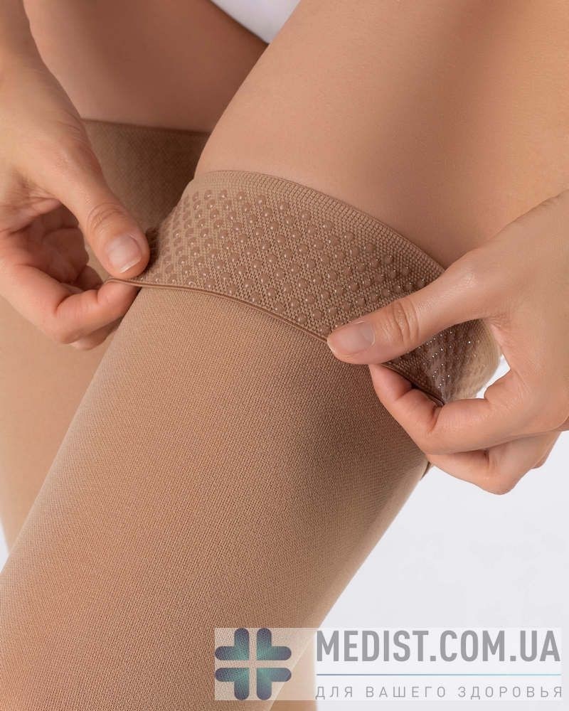 - Благодаря капельному нанесению медицинского силикона, манжета лечебних чулок пропускает воздух и позволяет коже дышать