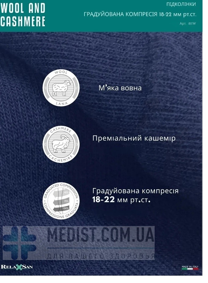Натуральные материалы шерсть и кашемир в составе антиварикозных гольфов Relaxsan Wool and cashmere сохраняют тепло, эффективно отводят влагу и поддерживают комфортную температуру кожи
